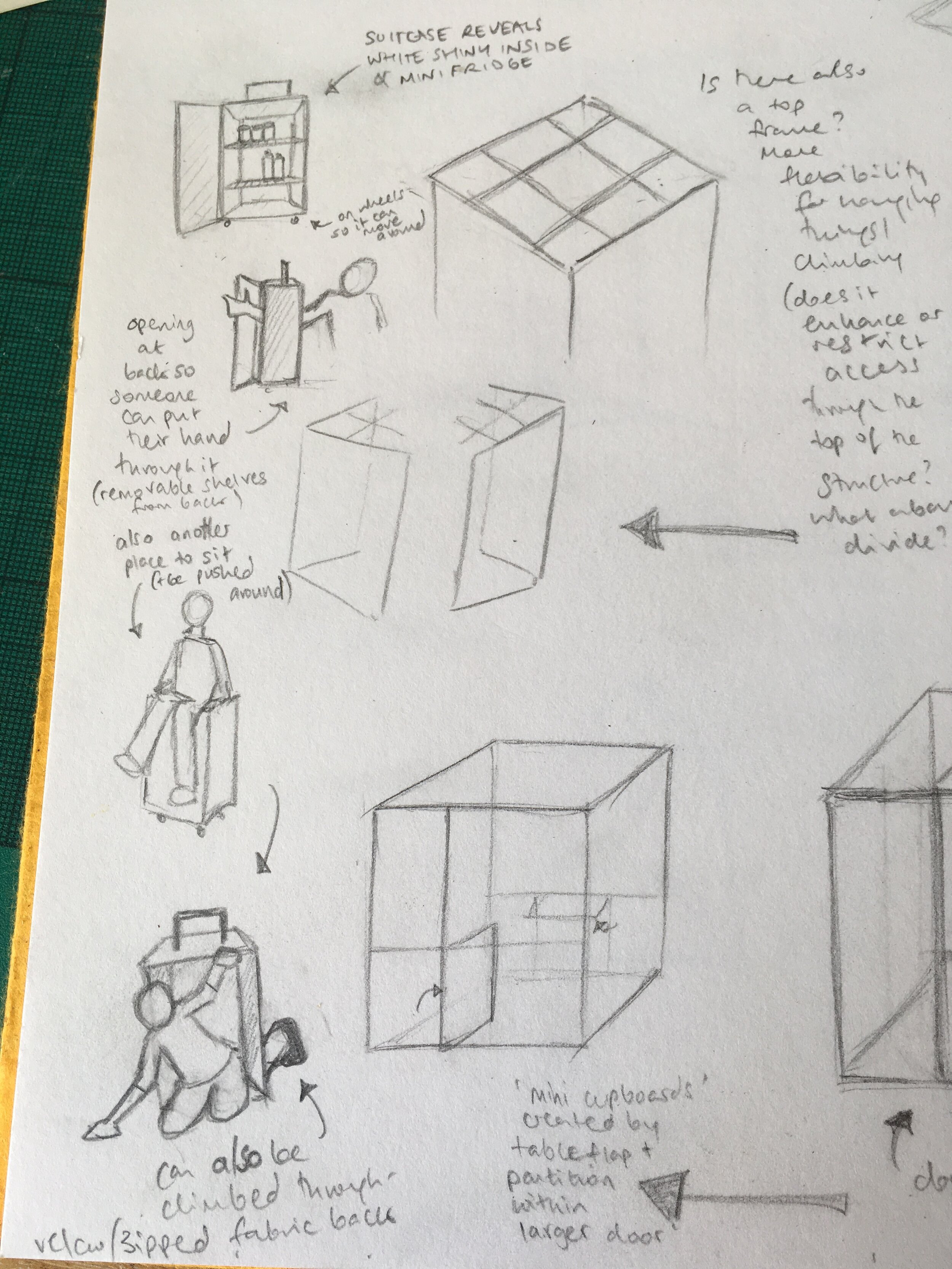 Tech drawings for the multiple use of set and props including the magical suitcase, that transforms into a minibar. Designs by Alison Neighbour for The Hotel Experience